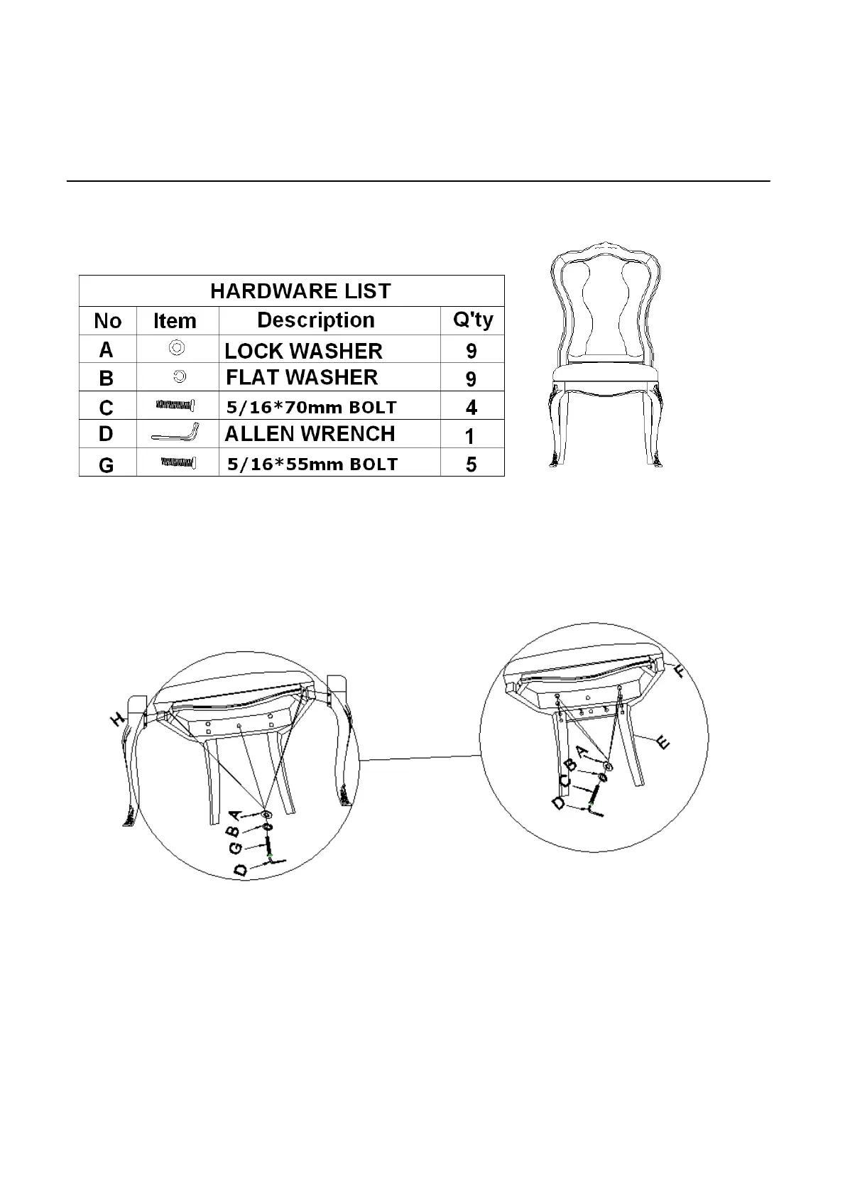 2. Tighten seat frame(F) to back legs of frame(E) by using bolt(G), lock washer(B) and flat washer(A)