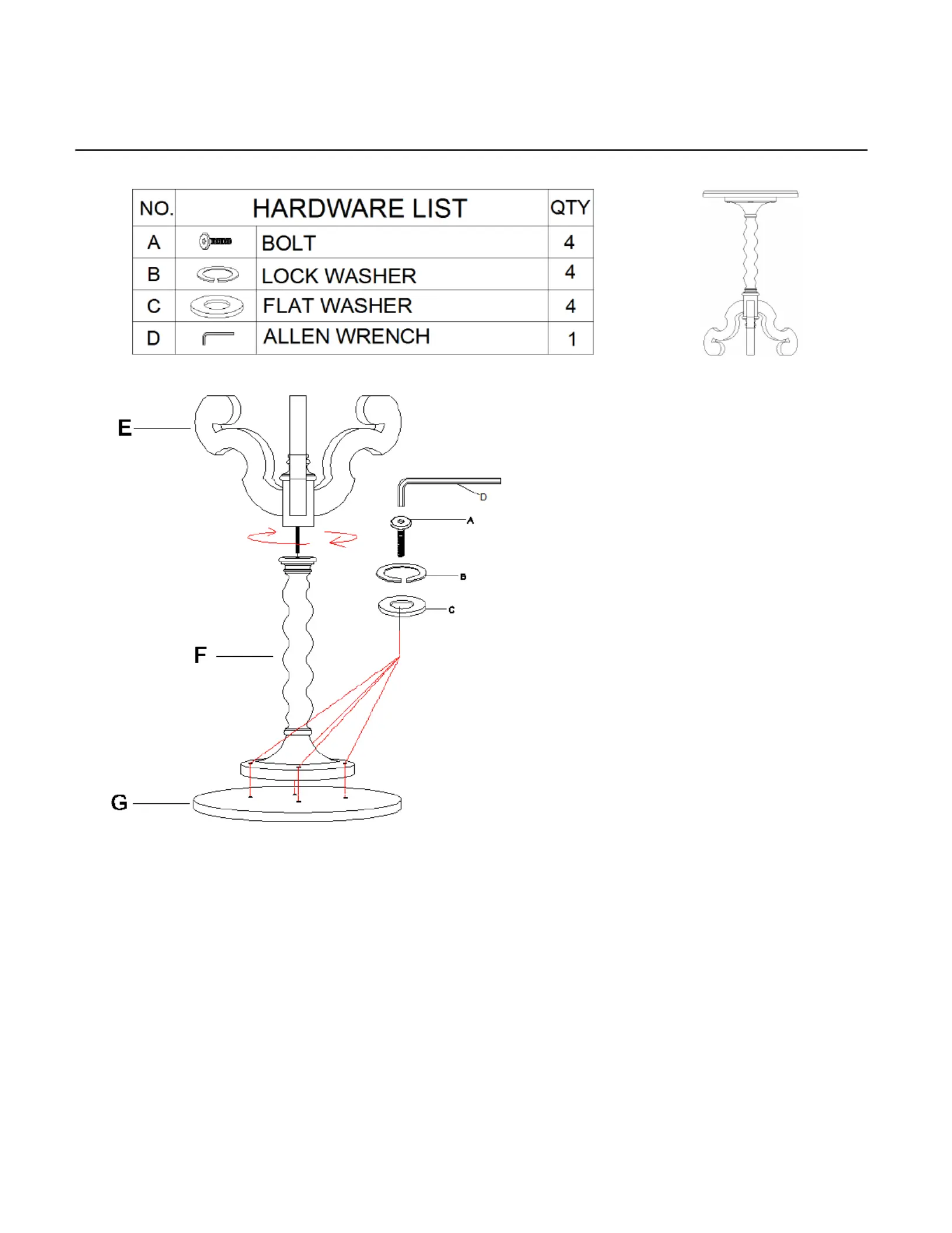 2. Align holes on center post (F) to holes on top