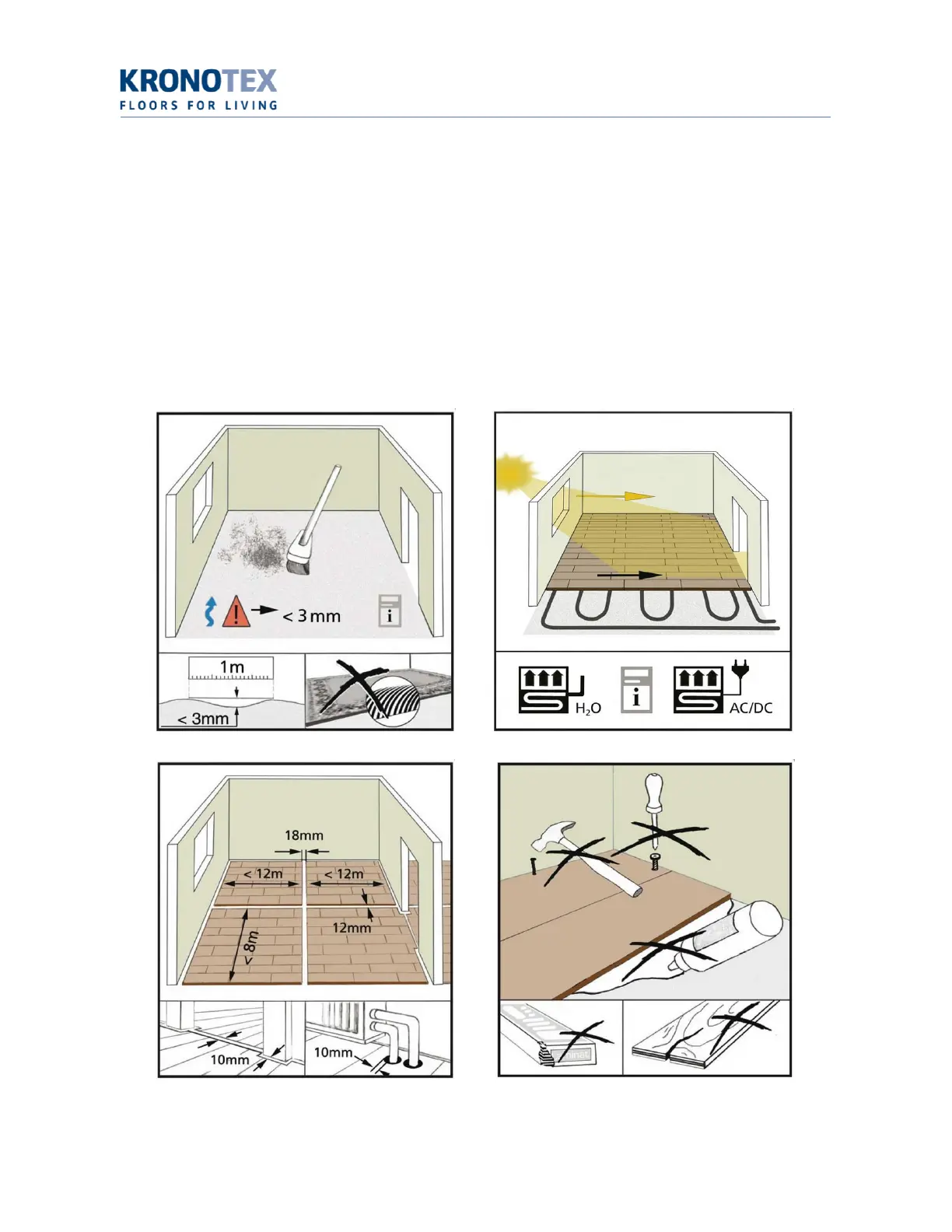 Prior to laying, please store Kronotex flooring horizontally in unopened packaging at room temperature